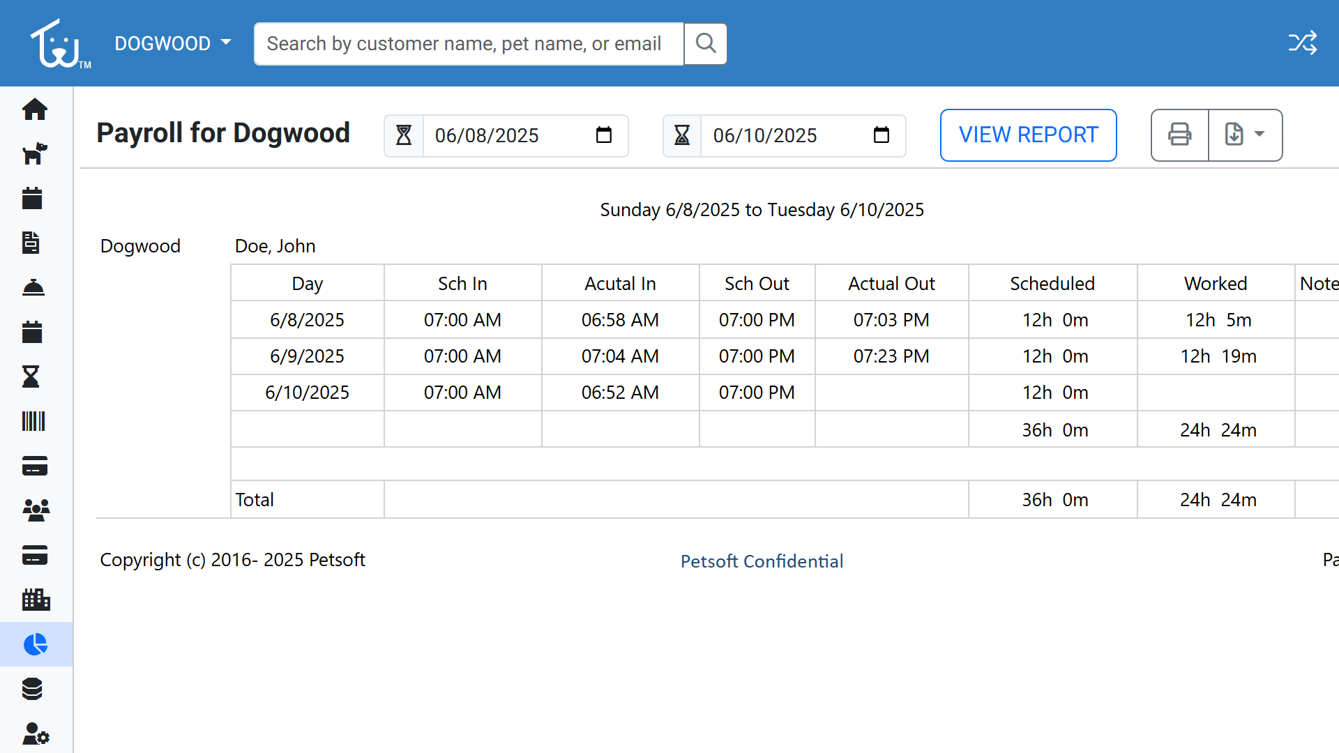 Track employee hours and overtime with Petsofts integrated payroll reporting so you can quickly review time entries and attendance.